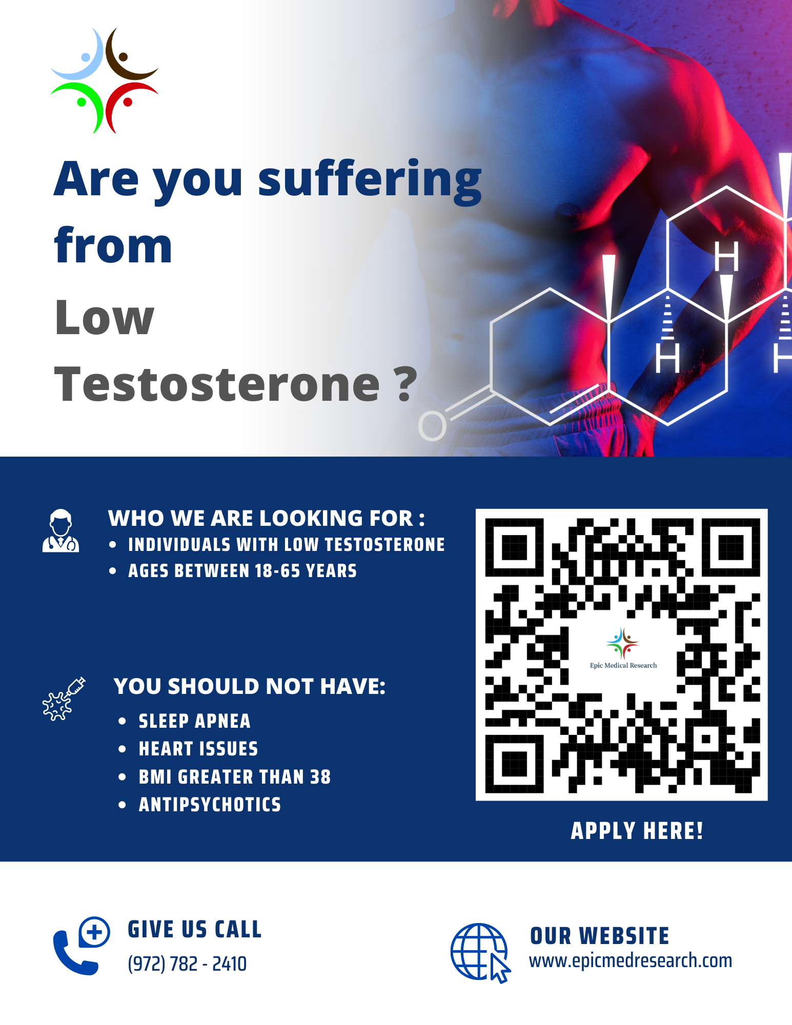 At Epic Medical Research, we are dedicated to advancing the treatment of low testosterone through clinical trials. Qualified research participants will receive financial compensation for their time and travel, study-related medical and psychological evaluations by our expert doctors, and access to the investigative study medication at no cost. Join us in the fight against low testosterone and contribute to the future of medical research through clinical trial participation!